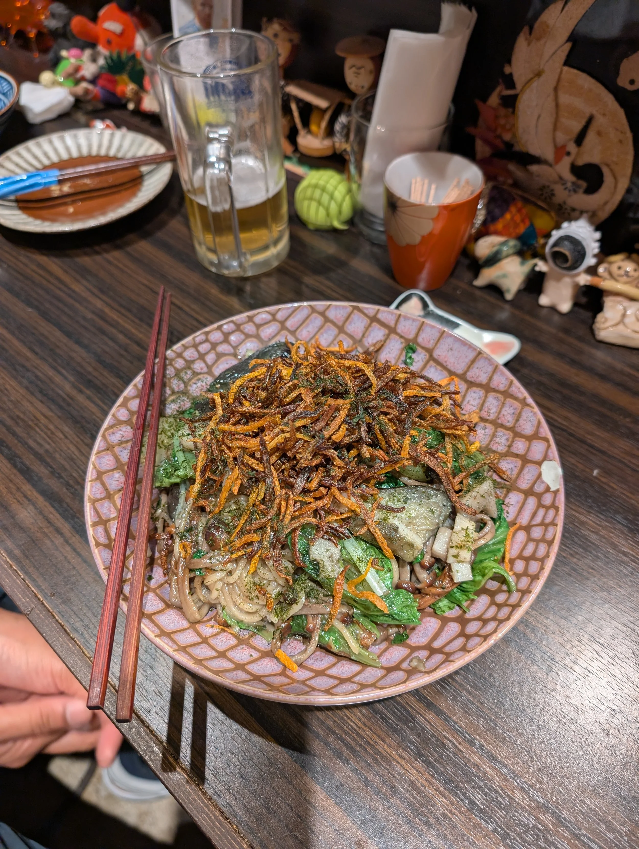 While this spot is genuinely popular among vegans for its accommodating, eccentric owner and vegan okonomiyaki, it is definitely not a budget destination. The decor is unique - adorned with 1000s of dusty collectables, and the entrance is one of the kind, the seating is cramped and atmosphere busy. As a museum, or exhibition it’d be great - but this is restaurant, an expensive one, and the food isn’t very good.